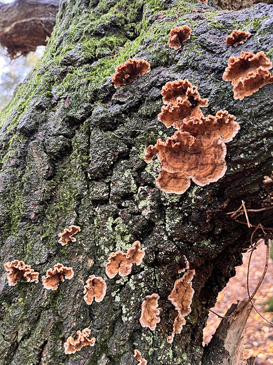 What I have been amazed at is the large number of fungi about, the weather and temperatures during October and November has been much warmer and humid than usual for this time of year, and the woodland has provided the ideal habitat for it to grow and flourish, many varieties seem to appear overnight, especially the Sulphur Tuft and Shaggy Parasols. Birch Polypore seems to thrive all year round. I have also noticed several Fly Agaric in the usual places still popping through the leave litter. One of my favourite fungi is the delicate Candle stick fungi, which can be found popping up through the moss-covered tree stumps on the woodland floor. Other fungi of note are the Turkey tail, Dead Man’s Finger (Xylaria polymorpha), similar to the Candle stick fungi, but black, and Hoof Bracket Fungi.