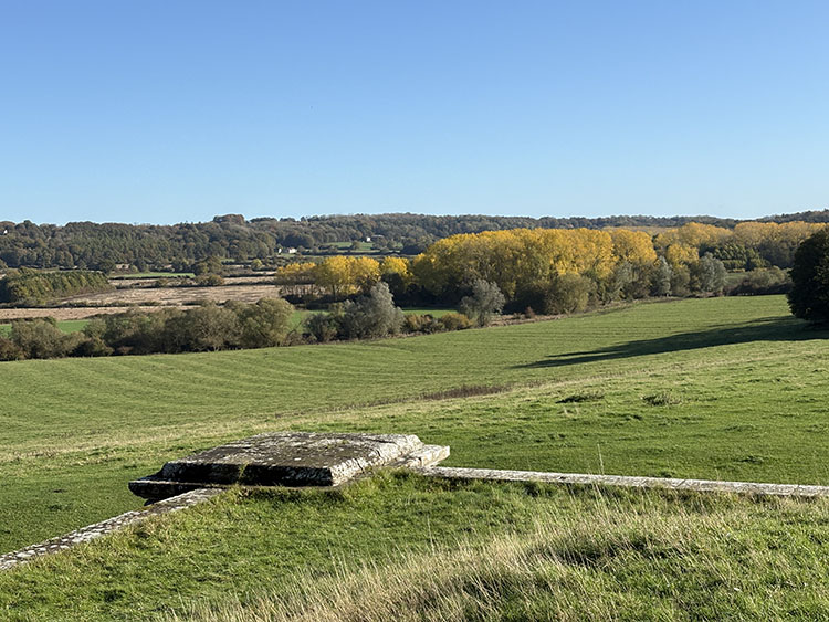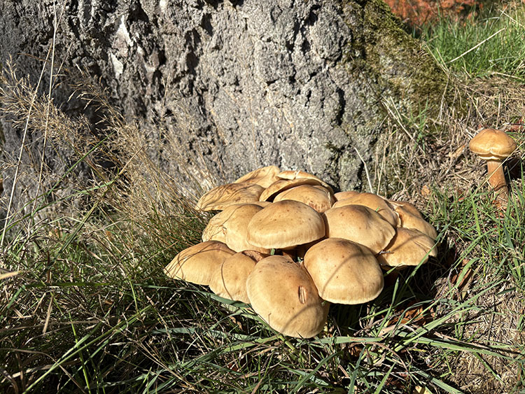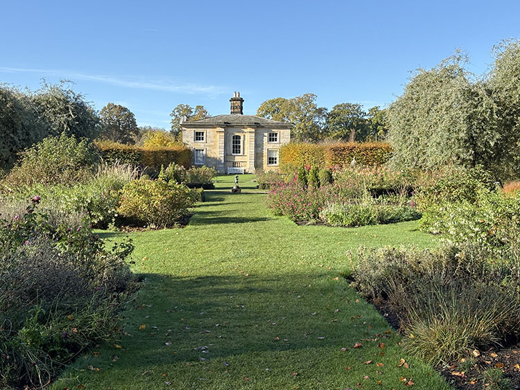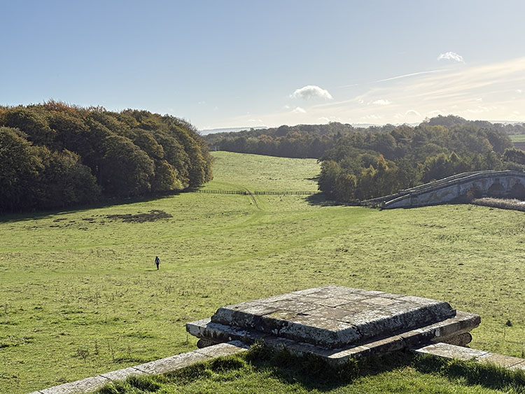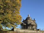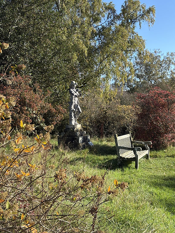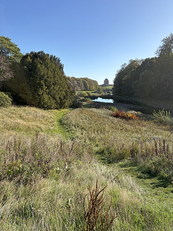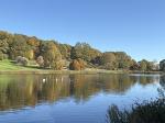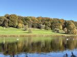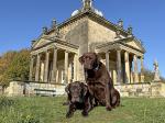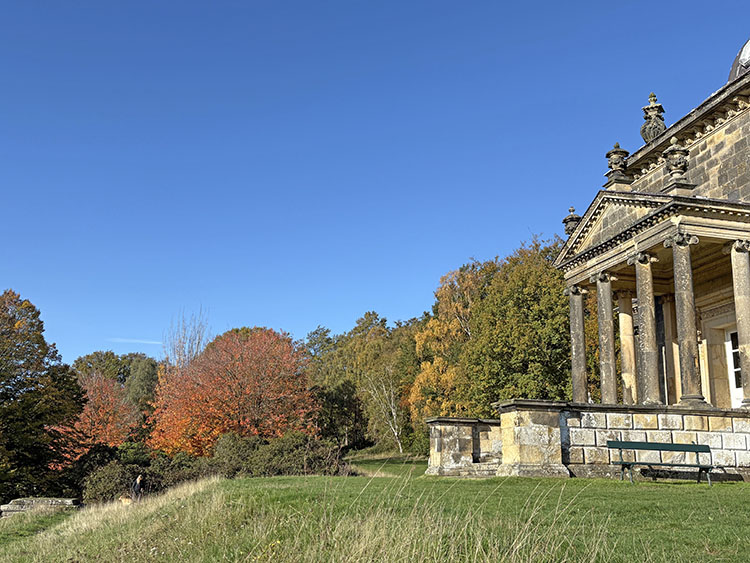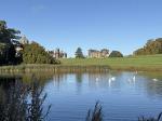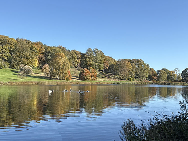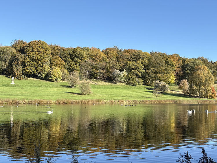 Continuing our walk along the driveway, we headed through the opened wooden gate and into the Walled Garden, as always, the grass terraces were looking nicely manicured and tidy, despite being late autumn there was still plenty of colour amongst the flowers in the borders. The vegetable plot/Kitchen Garden was full of seasonal vegetables and the formal gardens were bright and colourful too. It was nice to chat and exchange pleasantries with several of the volunteer gardeners who were busily tidying up and weeding some of the borders. The gardens will be closing shortly (12th November) for winter maintenance. Leaving the garden through the wrought iron east gate we turned left and followed the gravelled road towards the main house, the sun was shining brightly through the trees along the lime tree terrace, casting shimmering shadows across the ground. As we reached the Southern aspects of the house we stopped for a few moments to admire the view of the house basking in the late autumn sunlight, the Golden dome towering above the roof line was glistening brightly in the warm sunshine. It was nice to see lots of other visitors out for a walk too, some over by the Atlas fountain, others walking around the South Lake and others heading over to the Temple of Four Winds. We continued our walk along the gravelled south terrace, passing the house on the left, the sunlight was highlighting much of the intricate carvings on the stonework on the south face of the house, there must be a story to tell there and something for me to research in the near future. Leaving the house behind, we skirted around the Time Capsule and made our way up the grassy terrace to the bench at the top of the hill where we sat and enjoyed the pleasant views looking back towards the house and Atlas fountain. Passing through the wooden gate we continued into the woodland, the autumn colours were vibrant and rich in colour, amplified by the morning sun shining through the trees. Birdsong was vibrant in the woods with Robin, Wren, Chaffinch, and Great Tits enjoying the warm autumn sunshine and singing their heads off as we walked past them. There was plenty of fungi about on the woodland floor, clusters of Sulphur Tuft, Honey Mushroom and Brown Roll Rim were everywhere amongst the leaf litter and on the bottom of rotting tree trunks. We had a lovely walk through the woods, Meg was in her element rolling amongst all the fallen autumn leaves. After passing through another wooden five bar gate, we continued through the woods till we reached the Temple of Four Winds. I always like to walk around the outside of the temple just to admire the views of the rolling countryside, and to see if we could see and hear the Buzzard which usually lives amongst the trees close to the Mausoleum. After having a photo stop with Meg and Gracie at the Temple we headed down the slope to the Temple Hole to have a look at the Shepherd Boy before climbing back up the muddy slope to the South Lake. This end of the lake is one of my favourite views, no matter what time of year, looking over the lake towards the house is always quite special. Today a small flock of Swans caught me by surprise as they flew over our head and landed at the far end of the lake with much splashing and commotion, to join a bigger flock of Greylag Geese and some Tufted Ducks. Once my heart rate settled down, we continued our walk along the water’s edge stopping every now and then to watch the swans’ feed and graze under the surface of the water. The trees on the far side of the lake and along the Temple Terrace heading into the woods were taking on a beautiful Autumnal palette with a mixture of colours ranging from golden brown, and rusty red to shades of light green. As we rounded the end of the lake we made our way up the gentle slope towards the house. From here it is just a pleasant five-minute walk passing the Walled Garden on our left to the Courtyard Cafe, where we all enjoyed a very pleasant brunch sat outside in the warm afternoon sunshine, Meg and Gracie enjoyed their warm sausage and biscuit doggie breakfast too! I drove home with two contented sleeping dogs in the car.