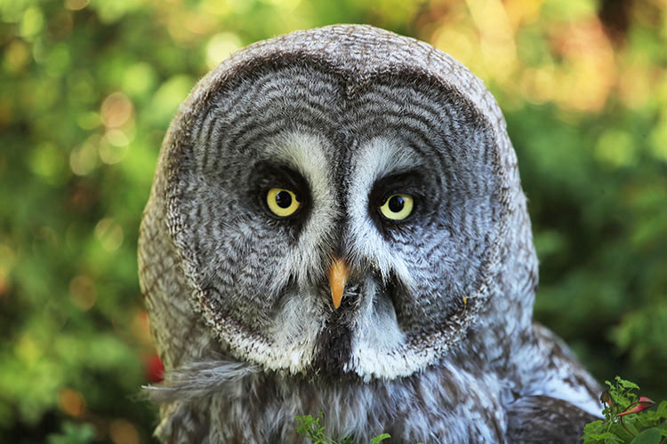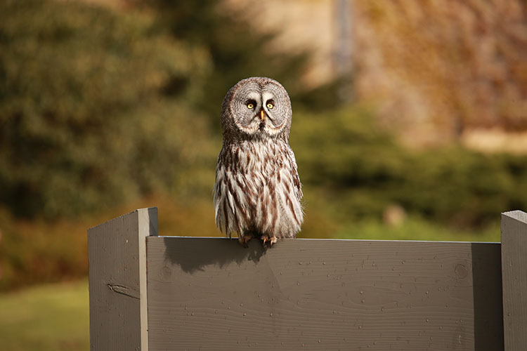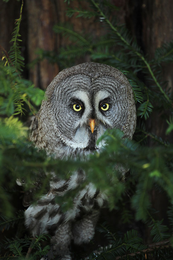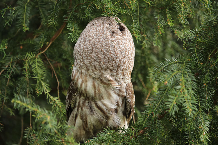 The female will lay between two to six eggs at one to two-day intervals. The female does all the incubation, which starts when the first egg is laid. After four to six weeks the chick’s hatch. The male provides all the food for the young, which is torn into smaller pieces by the female. When food is scarce the female Great Grey Owl will often starve herself to feed her chicks and may lose up to a third of her body weight. The chicks will leave the nest after approximately a month and can fly well after two months. The young stay close to home and are cared for by the female for some time after leaving the nest.