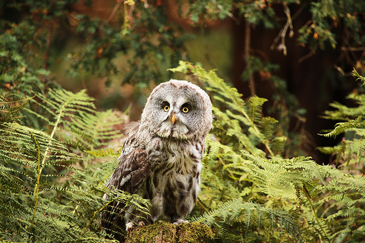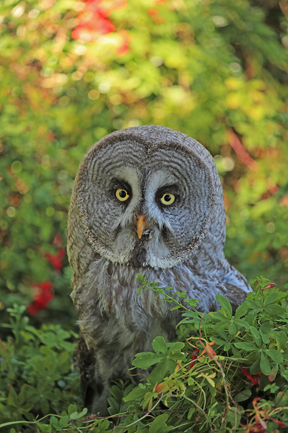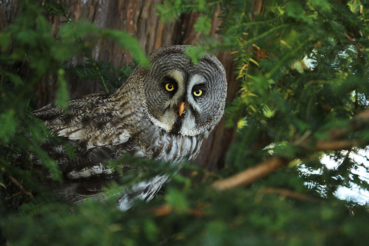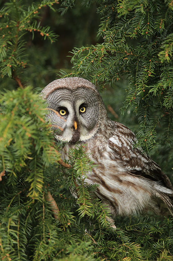 Great Grey Owls are generally a quiet bird and do not call attention to themselves, they tend to avoid areas with people and quietly perch on the edges of meadows or forests and are nearly invisible to the naked eye despite their size. They hunt at night and during the hours before dawn and dusk. They quietly fly low, on broad wings, over meadows watching and listening for small mammals.
