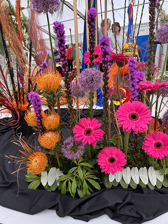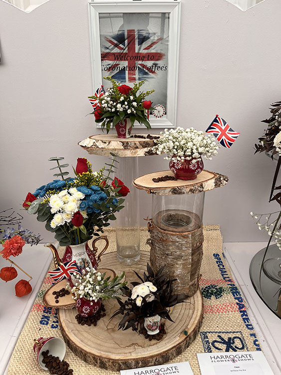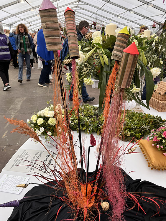 Fortunately, it was a nice, pleasant day, there was a cool breeze which kept the temperature down a little, but the sun was shining and it was dry, all in all a nice day for walking round the flower show. There were numerous talks/lectures being given in the main hall ranging from flower arranging to Bee Keeping and Cooking. We continued our walk round admiring all the trade stands, stopping for an ice cream whilst we sat and watched a musician playing a keyboard in the Bandstand. After several minutes we continued our walk around the showground, calling into the food hall and then into the exhibition hall with all the floral exhibits. Some of the displays were amazing creations, vibrant and colourful, there was an excellent display to celebrate the forthcoming Coronation. Another that caught my eye was a quirky displays of toilets and cisterns.