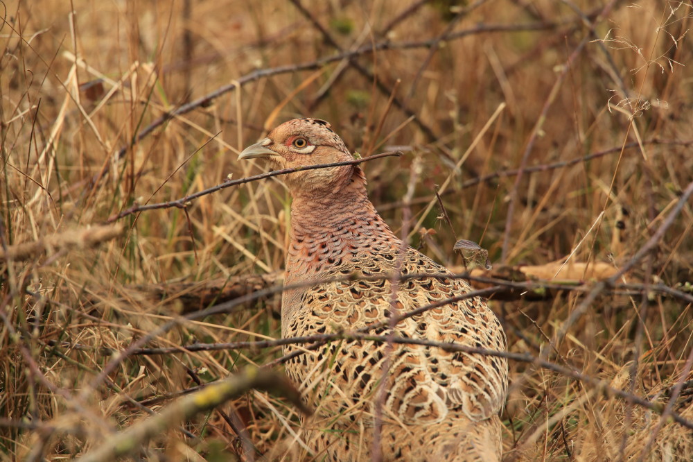 Over in the field to the right of the hide was a huge flock of about fifty Wood Pigeon, all busily grazing amongst the long grass and in the relative safety of the reed beds were a pair of Canada Geese who every now and then would pop their head above the reeds for a look around before dropping down again.
