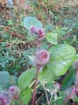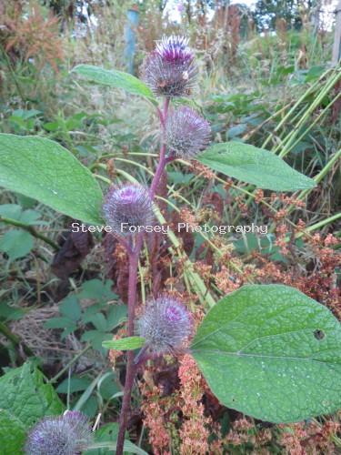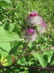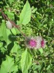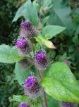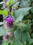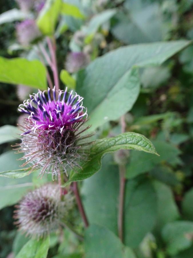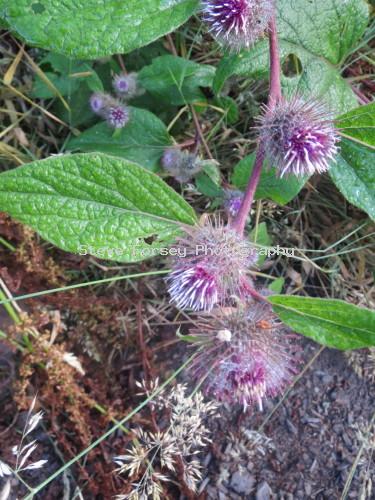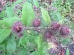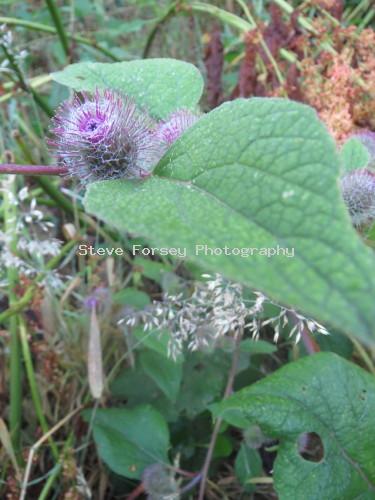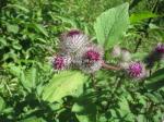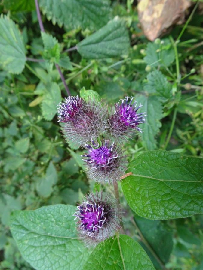 Often known as burweed, louse-bur, common burdock, button-bur, cuckoo-button, or wild rhubarb, it is a biennial plant, native to Europe, but is now widespread throughout most of the United States. Lesser Burdock produces purple flowers in its second year of growth, from July to October. Outer bracts end in hooks that are like Velcro. After the flower head dries, the hooked bracts will attach to humans and animals in order to transport the entire seedhead