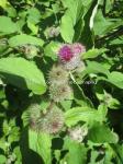 It can grow up to 1.5 metres tall and form multiple branches. It is large and bushy. Flowers are prickly and pink to lavender in colour. Flower heads are about 2 cm wide. The plant flowers from July through October. The flowers resemble and can be easily mistaken for thistles, but burdock can be distinguished by its extremely large (up to 50 cm) leaves and its hooked bracts. Leaves are long and ovate. Lower leaves are heart-shaped and have very wavy margins. Leaves are dark green above and woolly below. It grows an extremely deep taproot, up to 30 cm into the ground.